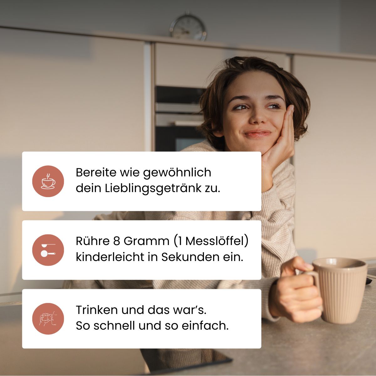 Einfach in dein Lieblingsgetränk einrühren und genießen. Deine kinderleichte Routine!