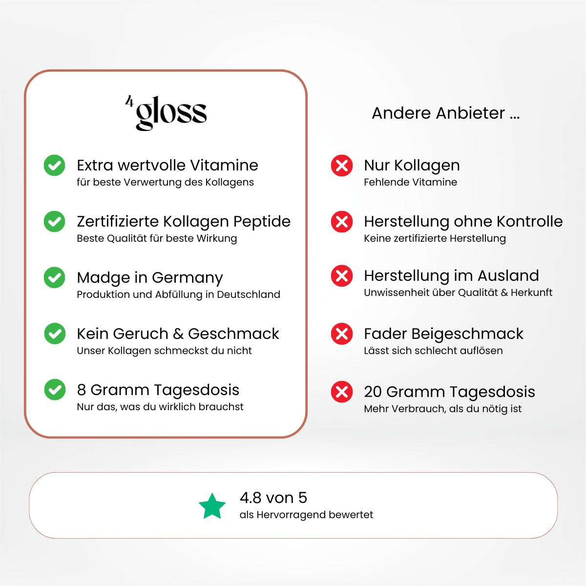 Bei 4gloss steht Qualität an erster Stelle. Unser Kollagen wird in Deutschland nach höchsten Standards hergestellt. Mit ausgewählten Zutaten garantieren wir dir ein Produkt, das nicht nur wirksam, sondern auch sicher ist.
